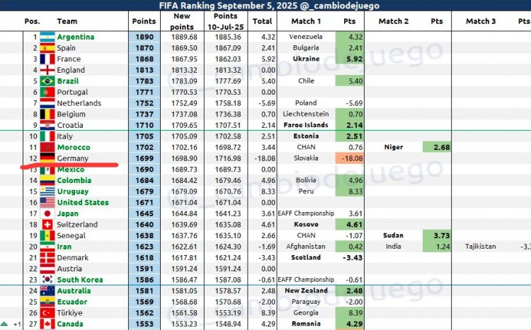 9月6日,德国国家足球队在世预赛中以0-2负于斯洛伐克。赛后,国外知名足球博主“_cambiodejuego”通过公式推算出德国队当前的实时FIFA排名情况。
