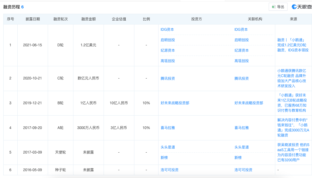 商业模式跑通后,资本迅速向小鹅通聚集,自2015年成立以来,小鹅通共完成六轮融资,累计融资额超过12亿元人民币。在其投资者列表中,可以看到经纬中国、真格基金、腾讯战略、高瓴创投等一众知名投资机构的身影。