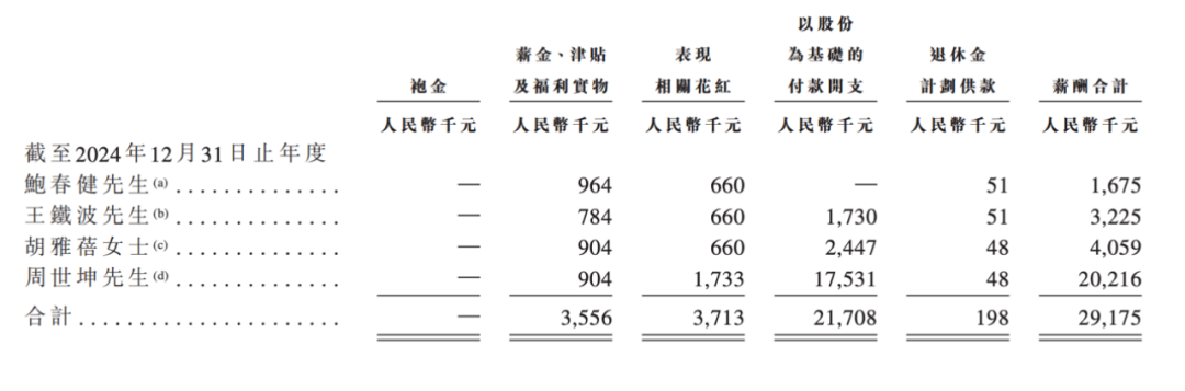 其中很大一部分是以股份为基础的奖励,周世坤近三年的股权激励费用分别达到1019万元、1748万元和1753万元。相比之下,创始人鲍春健同期薪酬仅为188.4万元、183.2万元和167.5万元,数额远低于CFO。